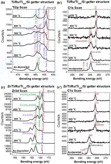 The C 1s XPS spectrum evolution with thermal activation for all three NEGs also showed two different regimes (Figure 3a’–c’) [13,21,22,23,24,25,26,27]. In the first regime, for the Ti upper-layer of the Ti/Si and Ti/Ru/Si NEGs, the main elementary surface-adsorbed C–C or C–H peak (BE = 285.3 eV) underwent a transformation to a metal-oxycarbide (TiC–O), accompanied with a metal-carbide (TiC) at an activation temperature of 300 °C. While for the Zr upper-layer of the multilayered Zr/Ti/Ru/Si NEG, only one direct transformation to a metal-carbide (ZrC) at 275 °C was observed. In the second regime, the only persisting peak of the carbide phase (BE = 281.6 eV) showed a slight intensity increase up to 450 °C for multilayered NEGs with a Ru sub-layer than for a single layer Ti NEG.