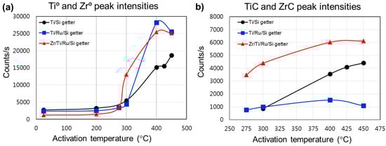 In order to establish a comparison elucidating the performance related to each investigated getter structure, we plotted (Figure 4) the intensities of the metallic and carbidic states evolution during the thermal activation. The metallic states generation on the getter surface enhanced the sorption properties, while the formation of carbide or other stable compounds reduced the getter activity by reducing the density of available metallic adsorption sites favorable to react with gas species on the surface. Hence, the distribution and evolution of the metallic and carbidic species on the getter surface gave insight into the gettering mechanism and performance evaluation after each activation process. Figure 4a shows the comparison between the metallic state intensity variation and activation temperature. The metallic state (Ti0, Zr0) intensity was shown to be higher for getters with a structure using a Ru sub-layer, whereas the Zr/Ti/Ru/Si NEG presented better values compared to the Ti/Ru/Si NEG before activation at 400 °C. Furthermore, it was also seen that the activation of the Zr/Ti/Ru/Si NEG starts to be triggered at a temperature lower than the other getters. Meanwhile, the carbidic state intensity was found to be higher for the Zr/Ti/Ru/Si NEG compared to Ti-upper layer based NEGs without and with a Ru sub-layer (Figure 4b). Also to be noticed is that the carbidic intensity level, for the getters of a structure with a Ru sub-layer, underwent an apparent continuous increase with activation temperature from its appearance in the second regime.