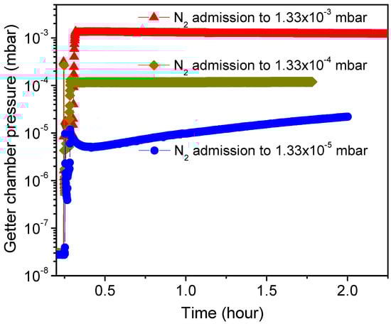 Regarding the investigations of the activation effect on the pressure–time dependence, the measurements were performed by means of a static method. In this method, after activating the getter sample at a specific temperature for one hour, and subsequent cooling back down to room temperature, the all valves (AV and GV) of the getter test system were closed to isolate the getter chamber from the pumping line (TMP and scroll pump), and then immediately after a moment of time of about 3 min, when the getter chamber pressure had stabilized around 10−7 Torr, a flow of pure nitrogen (N2) gas was induced through the high-precision variable leak valve (VLV) to rapidly reach a pressure of 10−5 Torr inside the getter chamber. The gas was immediately stopped, by closing the leak valve, once the set pressure has been reached. Pressure–time dependence was recorded for a period of about 3 h, starting from the moment of gas-inlet valve closing until the chamber outgassing pressure became largely dominant.