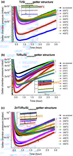 The pressure–versus–time curves after each activation temperature for the three investigated getters are shown in Figure 6a–c. These curves were recorded immediately after closing the leak valve (VLV) with which N2 gas was admitted into the UHV sealed getter chamber to a pressure of 1 × 10−5 Torr. It can be seen that all getters with different structures exhibit a similar N2 sorption trend. The curves indicate that the getter chamber pressure decreased quickly and reached a kinetic equilibrium corresponding to the minimum pressure within a period of time; varying from 0.5 to 1.5 h depending on the thermal activation temperature value. After this equilibrium, the pressure began to progressively increase with measurement time. Such behavior could be mainly attributed to the vacuum chamber walls and the sample holder outgassing, whose flow rate became higher than the rate of the gettering process. It was also seen that in the early stage of the pressure–time records as the rate of the pressure decreasing was higher as the reached equilibrium pressure level was minimal (minimum pressure value on the curve). This minimum level was reached for, both, the multilayered Ti/Ru/Si and the Zr/Ti/Ru/Si NEGs at the activation temperature of 250 °C, except for the single-layered Ti/Si NEG sample with which the minimum pressure level happened after activating at 200 °C. Above those activating temperatures, the equilibrium pressure levels increased and, again after reaching an activating temperature range around 375 °C, the pressure level slightly re-decreased, but effectively only for the multilayered getters with Ru sub-layer. Furthermore, such structured getters containing a Ru seed sub-layer (Ti/Ru/Si and Zr/Ti/Ru/Si NEGs) at higher activation temperatures (425 °C and 450 °C) manifested a notable resistance to the outgassing effect by lowering the pressure level as is seen at the right part of the curves at around 3 h of pressure recording (see Figure 6b,c).