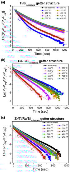 Kinetic curves for nitrogen sorption after different activation temperatures; (a) single layer Ti/Si NEG; (b) multilayer Ti/Ru/Si NEG and (c) multilayer Zr/Ti/Ru/Si NEG.