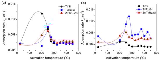 The reaction rate constants (ka1, ka2), calculated after each activated temperature for all studied getters, are shown in Figure 8a,b. The ka1 constants demonstrate an increase until the 250 °C activating temperature (except Ti/Si NEG with ka1 max at an activation temperature of 200 °C) followed by a subsequent decrease with increasing activation temperatures. The origin of such behavior has already been discussed above in the sense that a higher rate constant was found to be related to getter surface cleaning (NEG sub-surface reduction by metal-hydroxide formation) and its drop in carbide/nitride sites formation. Regarding the rate constant ka2, whose effect was considerable only in the getters without a Ru sub-layer, their values did not undergo any substantial change with activation temperature.
