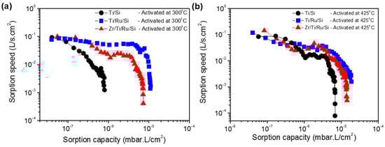 In the following, the sorption performance characterizations of the three investigated NEGs were measured and compared. Figure 9a shows the sorption speed as a function of sorption capacity at room temperature for Ti/Si, Ti/Ru/Si and Zr/Ti/Ru/Si getters activated at a temperature of 300 °C for 1 h. It can be seen that the sorption speed for the single layer Ti/Si NEG decreases rapidly and ends with a low sorption capacity at around 1 × 10−6 mbar·L/cm2. While for the Ti/Ru/Si and Zr/Ti/Ru/Si multilayered NEGs, the sorption speeds were higher and manifest as a slightly inclined plateau shape and diminish at a sorption capacity on the order of 1 × 10−5 mbar·L/cm2. For a higher activation temperature of 425 °C (Figure 9b), the three getters exhibit together a plateau having approximately the same sorption speed evolution. However, the multilayered Ti/Ru/Si and Zr/Ti/Ru/Si NEGs have demonstrated a sorption capacity roughly four times higher than the one measured with the single layer Ti/Si NEG. The low measured sorption properties, previously exhibited by the three getters after the activation temperature of 300 °C (see Figure 9a), were directly corroborated by the diminution of the reaction rate constant (Figure 8a) measured from the nitrogen pressure–time evolution. The sorption weakening, in this activation temperature range, can be accounted for by the getter surface poisoning effect that results, during the activation process, in reacting contaminating gaseous impurities (CO, CO2, C–C, H–C, N2, etc.) adsorbed on the getter surface with getter metal. Thus, leading to metal carbide (probably also nitride) species formation on the getter surface as determined by XPS analyses. This poisoning process can spread out in a thin sorption blocking layer leading to a sorption decrease and even the degradation of the gettering ability.
