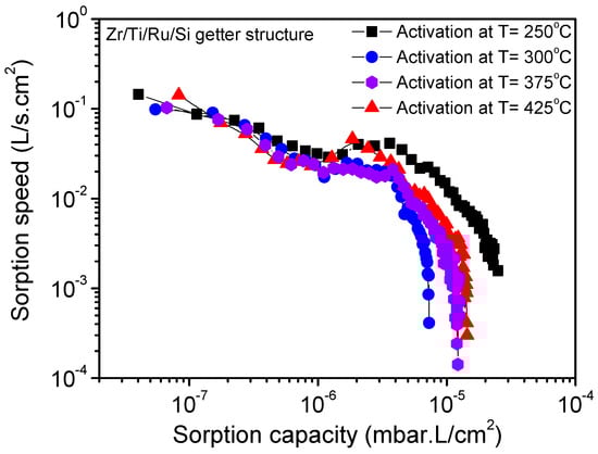 The poisoning phenomenon that hinders the gettering activity was revealed by the two above static sorption (P–time) and XPS analyses, to be primed just after the thermal activation over 250 °C and was diminished by raising the activation to high temperatures over 350 °C. Figure 10 shows the nitrogen sorption property evolution at room temperature for the Zr/Ti/Ru/Si multilayered getter after being activated at different temperatures for 1 h. It can be seen that for the activation at 250 °C, the resultant sorption characteristic curve has shifted to a higher sorption capacity value, while the activation at a higher temperature of 300 °C made the sorption characteristic curve shift to a lower range. Furthermore, for activations at higher temperatures, 375 °C and 425 °C, the sorption capacity limit seemed to stabilize in between. The lowering of the sorption capacity for activation temperatures over 250 °C was explained above to be due to the poisoning effect. However, the pronounced sorption capacity, observed at an activation temperature of 250 °C, was effectively associated with metal-hydroxide cluster formation on the getter upper surface. The getter surface state transformation, while activating at 250 °C, was elucidated. During the activation process, the gaseous impurities (O–H and C–H groups), already adsorbed on the getter surface, dissociated and resulted in hydrogen internal diffusion. This locally diffused hydrogen reacts in the passive layer oxide by forming a distributed metal-hydroxide cluster in the getter sub-surface [30,31,32], thus inducing an important reduction of the passivation oxide layer by establishing a high coexistence of sub-oxidized and metallic states; a configuration which is very favorable for high gettering activity. The reestablishment of the sorption capacity, after activating at 375 °C and above, is due, in addition of oxide dissolution/diffusion, to decomposition and diffusion of poisoning compounds, which probably concerned only the metal-hydroxides not including carbides as the C 1s peak did not undergo any considerable decrease in this temperature range (Figure 4b). Thereby the getter surface activity was re-improved. However, in spite of the obtained better sorption properties at a low temperature of 250 °C, a question is still open whether or not to exploit the getter activation at a higher temperature of 375 °C. In fact, this temperature is also advantageous; it is related to an effective dissolution of the passivation layer compounds into the seeping microstructure, engendered in the getter-bulk by the appropriate additional Ru sub-layer in the getter structure. Furthermore, it is also included in the temperature range compatible with the MEMS sealing process.