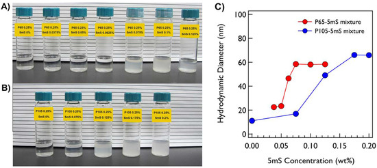 Both P65 and P105 only solutions are very clear and transparent at room temperature. On the other hand, when the 5mS concentration increases, the P65-5mS and P105-5mS mixtures become cloudy with a bluish color at 0.0625% and 0.125% of 5mS concentrations, respectively, which comes from the Tyndall effect (