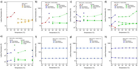 q region, and then analyzed with a sum model of vesicular form factor and core-shell cylindrical models for 35 °C and a single core-shell cylindrical form factor model for above 40 °C. The fitted variables are shown in