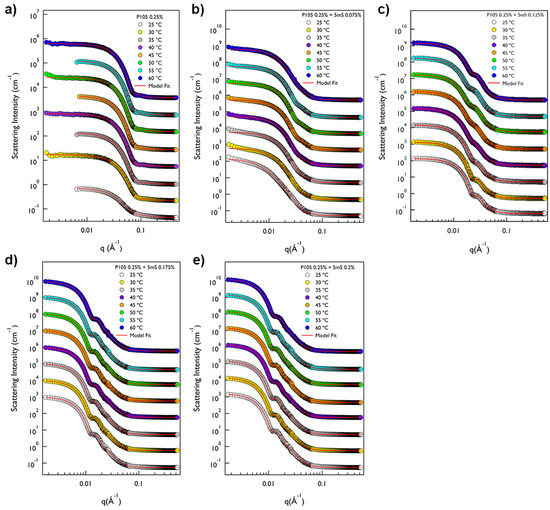 Figure 5a). The SANS intensity of the P105 only solution at 30~60 °C was well-fitted with a single model, the core-shell spherical form factor with the fitting variables (the core radius of 1.10~3.05 nm and shell thickness of 3.25~4.06 nm,