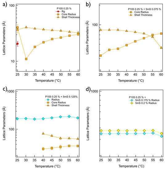 Figure 5b). As the temperature increases, the core radius of the P105-5mS mixture with the 5mS concentration of 0.075% is increased while the shell thickness is decreased, which arises from the increase of the hydrophobicity of PEO blocks. In addition, since the 5mS molecules can easily bind with Pluronic polymer with an amphiphilicity [