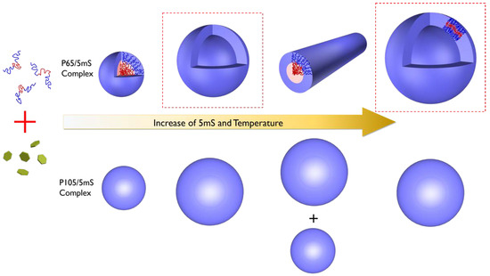 Figure 2a). However, since the solubility of 5mS molecules is highly dependent on the temperature, the 5mS molecules bound with Pluronic polymers are dissociated into the solvent with increasing temperature, leading to the relative increase of the hydrophilic mass fraction of the mixture. Therefore, the P65-5mS mixture solution with the 5mS concentration of 0.375~0.0625% shows the vesicle to cylinder phase transition between 30 °C and 35 °C (