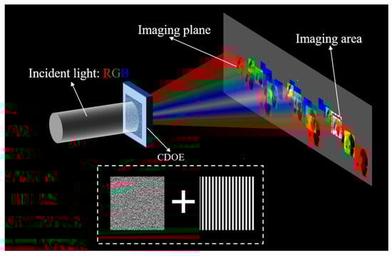 A diffractive optical element (DOE) is a phase modulation element that has the potential to significantly promote the miniaturization, integration, and arrangement of conventional optical systems [1,2,3,4,5,6]. More specifically, DOEs play a key role in the field of holographic imaging [7,8]. However, the working wavelengths of traditional DOEs are monochromatic; thus, multiple DOEs are always needed in the holographic imaging of color pictures, leading to complex and bulky systems.