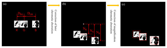 (a) The position shifts of red, green, and blue (RGB) components according to the parameters DRG and DGB; (b) the correction for lateral chromatic aberration; (c) the correction for magnification chromatic aberration.