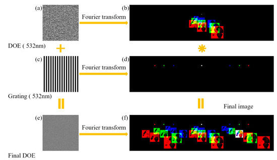 where * means convolution. It was noticed from Equation (10) that the final light field E can be obtained by the convolution of E1 and E2. The light field E1 was repeated in each order of the light field E2 generated by the grating phase. It was observed that the order position of different incident lights was different from Figure 3d, and the superposition of RGB components was achieved by using this property to complete the generation of color images (see Figure 3f).