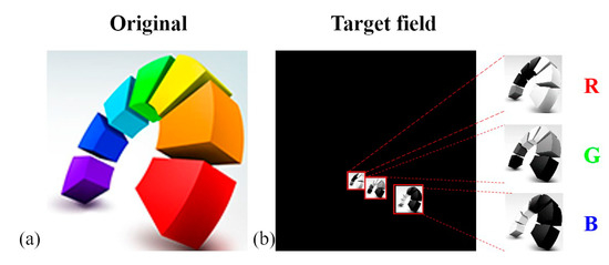 where XR·YR, XG·YG, and XB·YB were the corrected pixel numbers of RGB components, respectively. According to the aforementioned analysis, the color image was firstly decomposed into RGB components. The RGB components were then encoded and scaled in the same plane according to the calculations. Finally, the desired target field of the DOE was obtained as shown in Figure 2c.