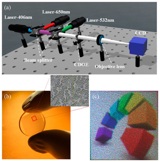 To further validate the feasibility of the proposed approach, corresponding experiments were carried out. Firstly, the CDOE was fabricated by using the photolithography. Silica was chosen as the substrate, and AZ9260 was chosen as the photoresist. The photoresist was spin-coated on the substrate at a rotation speed of 5000 rad/min. The process parameters of coating time, prebake temperature, prebake time, and the resist thickness were 30 s, 100 °C, 5 min, and 3 μm, respectively. A photolithography system was employed to perform the exposure. The illumination light source was an Hg lamp with a central wavelength of 365 nm. The total exposure time was 20 s. The process parameters of development, after-bake temperature, and after-bake time were 3 min, 120 °C, and 30 min, respectively. Reactive ion etching (RIE) was carried out to transfer the structure into the substrate. The etching gases were SF6 and CHF3, and the etching time was 80 min. The pictures of the obtained elements are shown in Figure 7b. The light beam paths were constructed as shown in Figure 7a, employing three light sources operated at wavelengths of 460 nm, 532 nm, and 650 nm, respectively. The three parallel beams produced by the laser modules were combined through two beam splitters/combiners (in the form of dispersion prisms) to obtain a mixed light of RGB. The mixed light was irradiated onto the CDOE and imaged by a lens onto a CCD camera. An example image captured by the CCD is shown in Figure 7c, which was consistent with the simulation results, producing nice imaging without optical cross-talk. Furthermore, the incident light is an RGB mixed light functioning as an incident light on the DOE, confirming the coaxiality of the proposed method.