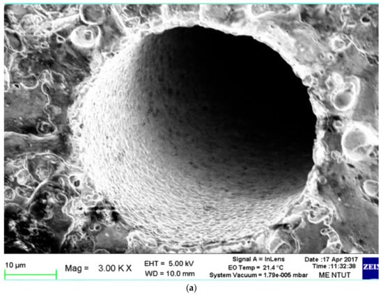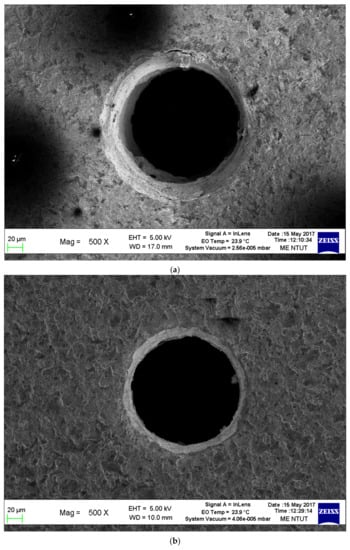 In general, micro-tools should be free of tool wear in the electrolytic machining process. However, in this present study, when the voltage between the two electrodes is higher than 12 V, an insulating oxide will be deposited on the surface of the microelectrode tool, which makes the tool longer by about 15 μm at 20 V and about 12 μm at 15 V. When the gap working voltage is lower than 12 V, there will be no deposits attaching to the microelectrode tool. However, due to the difficulty in the feeding control of the ECM, a partial discharge will occur, causing tool wear. The wear of the tool is about 25 μm at 5 V and about 5 μm at 10 V. These micro-tool changes are shown in Figure 10 and data as shown in Table 3. The inlet and outlet of the micro-holes are shown in Figure 11a,b. The quality of surface roughness and roundness of the micro-holes can be observed from the measurements of the horizontal inlet diameter of 167 μm and the vertical inlet diameter of 167 μm as well as the horizontal outlet diameter of 143 μm and the vertical outlet diameter of 145 μm, which are shown in Figure 11c and data as shown in Table 4. This phenomenon indicates that there were some small electrical discharge sparks during micro-ECM erosion. Differing from ECM, EDM uses a higher voltage electric field to conduct spark discharge machining compared to the micro-ECM. By using scanning electron microscope (SEM) to scan the surface of the drilling holes of the micro-EDM and those of the micro-ECM machining process as shown in Figure 12, we found that the surface of discharge cavity of the micro-EDM was more uniformed like a grapefruit peel is shown in Figure 12a, while the surface of ECM was smooth and evenly circled as shown in Figure 12b. Desktop micro-ECM is an excellent process for drilling the micro-holes in WC-Co material without leaving burrs. However, it is difficult to control the electrolytic current as well as to improve the control accuracy of the desktop micro-ECM machining and change different machining parameters so that we can enhance the machining performance in terms of material removal rate, average diameter, taper angle and roundness.