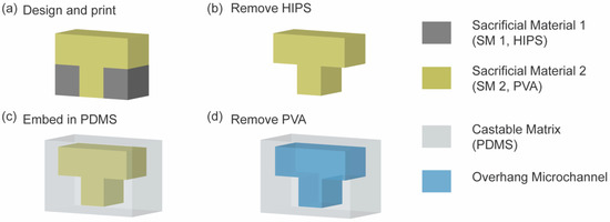 To overcome this limitation, herein we developed a method termed dual sacrificial molding that permitted to fabricate 3D microchannels using complex geometry of sacrificial molds. Dual sacrificial molding relies on the complementary pairing of two sacrificial materials and respective solvents used to remove them. We used HIPS as the first sacrificial material (Sacrificial Material 1 or SM1) that was removed in limonene (a type of terpenes). PVA was used as the second sacrificial material (Sacrificial Material 2, or SM2) that was removed using water. SM1 served as the support material for SM2 during the FDM printing session, while SM2 contained the design of microchannels to be fabricated. We demonstrated the proof-of-principle that microchannels were fabricated in the matrix of polydimethylsiloxane (PDMS) using the proposed method and materials. The present work harnessed the potential of using ubiquitously available FDM printing and typical filament as sacrificial materials to fabricate complex 3D microchannels in a range of matrices [10]. Specifically, the ability to create sacrificial molds with complex 3D features with PVA—which is soluble in water and capable of fabricating microchannels in matrices such as cell-laden hydrogels—has been limited to date. Our method provided a facile way to fabricate PVA sacrificial molds with complex 3D geometries with a simple FDM 3D printer. This capability would be potentially useful in fabricating 3D microchannels in various matrices, including biofabrication of 3D vascularized structures in hydrogels.