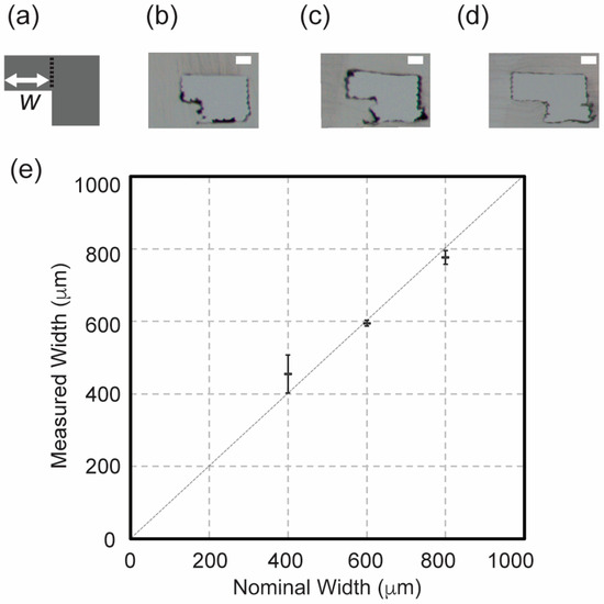 Characterization of the width of the overhangs in the serpentine microchannel fabricated by dual extrusion of HIPS and PVA. (a) Schematic showing a cross section of the overhang feature that was studied. The width of the overhang of the microchannel (w) was characterized. Representative images of cross sections of overhang features fabricated in PDMS with the overhang (b) 400 µm, (c) 600 µm, and (d) 800 µm. (e) Characterization of the variation of the width of the fabricated overhangs with respect to the nominal width designed by CAD. The data are mean ± SD (n = 10). Scale bar = 400 µm.