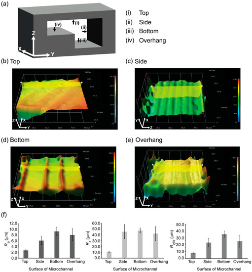 We profiled the four surfaces of the fabricated microchannels: (1) the top surface (originating from the last layer of the PVA filament, Figure 4a(i)); (2) the sidewall (originating from the stacking of the PVA filament, Figure 4a(ii)); (3) the bottom surface (originating from the first layer of the PVA filament deposited on the printing bed, Figure 4a(iii)); and (4) the overhang surface (originating from the interface between the HIPS layer and the PVA layer, Figure 4a(iv)). The morphology of the exterior of the FDM printed mold was responsible for the morphology of the inner surface of the microchannel.