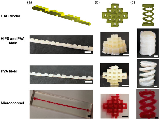 We designed dual sacrificial molding to obtain the final molds that were removable in water. One of the major advantages of this work is that the removal of the PVA sacrificial mold can be conveniently executed in aqueous conditions. As we demonstrated in the previous study [10], PVA sacrificial molding is shown to be useful to create microchannels in a plethora of matrix materials ranging from structural polymers to hydrogels. PVA is an excellent material as a sacrificial mold that can be dissolved in biologically relevant matrices such as cell-laden hydrogels. The method we developed here enabled to create microchannels with complex 3D geometries that were not attainable with simple PVA molds. As commercially available FDM 3D printers and filaments become low-cost and readily available, we envision that the method presented here will serve as an essential method to facilitate complex 3D biofabrication—fabrication of vascularized structures in biologically relevant and cell-laden matrices that serve as a platform from fundamental studies on cellular biology to applications in drug screening and discovery.