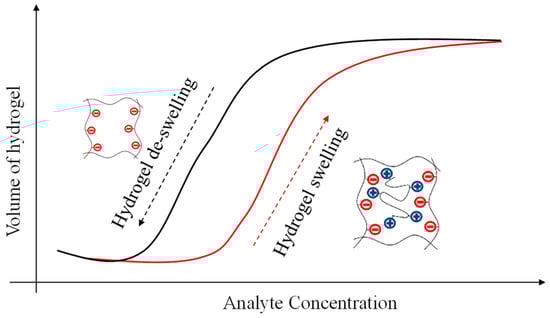 Chemical, biological, and gas sensors usually rely on sensing materials that change their electromagnetic and physical properties in response to molecules and chemicals of interest (analytes). These changes are then measured with electric, magnetic, optical, thermal, or mechanical techniques to identify and quantify the analytes. Hydrogels and aerogels are nearly ideal sensing materials because they contain large voids and open regions (cages) in their structures. These voids allow liquid and gas molecules to diffuse in/out of the hydrogel interior thereby resulting in physical, chemical, electromagnetic, and mechanical changes in the hydrogel. Hydrogels’ cage-like structures comprise cross-linked polymer networks that can be manipulated to interact with molecules with different shapes, ionic content, and pH [,]. Moreover, at the microscopic and nanoscopic level, the hydrogel structure can be modified with functional groups for sensitive and selective interactions with specific molecules. Figure 1 schematically shows a hydrogel functionalized with pendant negatively charged molecules that attract a target positively-charged analyte. The combination of these two oppositely-charged molecules results in dimensional, electrochemical, and physical changes in the hydrogel.
