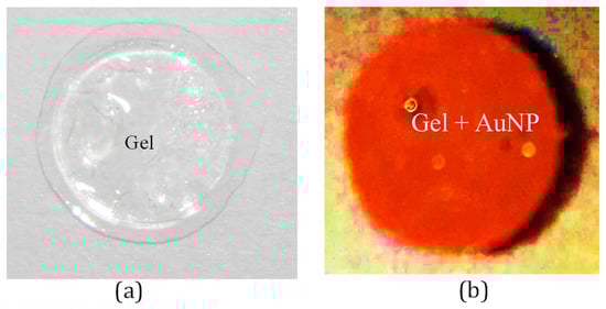 Photograph of the synthesized hydrogel. (a) Undoped hydrogel. (b) AuNP-doped hydrogel.