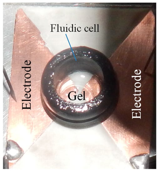 Impedance spectroscopy is a well-established electrochemical technique for measuring hydrogel response to different analytes [,,]. In this paper, impedance spectroscopy was used to measure the impedance change of the synthesized hydrogel as a function of its ionic content. As shown in Figure 3, the hydrogel was placed inside a fluidic cell (volume of 472 μL) centered over the 1 mm wide inter-electrode gap of two planar triangular 35 µm-thick copper electrodes. The substrate for the copper electrodes was a Roger RO4003C hydrocarbon/ceramic material of thickness 1.524 mm from Rogers Corporation (Chandler, AZ, USA). The fluidic cell was glued to the substrate/copper electrodes with epoxy. The sensor terminals were connected to the terminals of a 4284A Hewlett Packard Precision LCR meter (Hewlett Packard, Palo Alto, CA, USA). An analyte was introduced into the sensor cell, and the series capacitance and series resistance of the hydrogel sensor were monitored from 20 Hz to 1 MHz in 25 logarithmic steps.