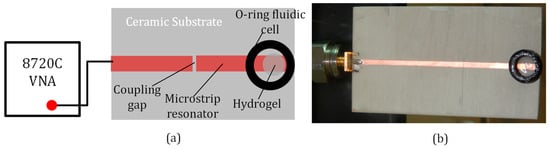 Sensor for monitoring hydrogel response with microwaves in the contact mode. (a) Schematic of the sensor. (b) Photograph of the sensor.