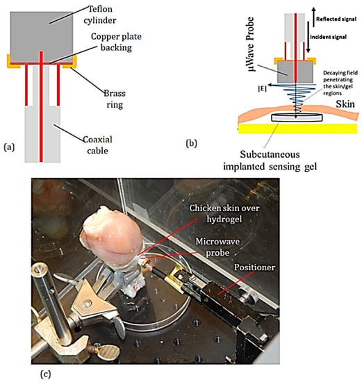 Microwave coaxial probes have been used in the past to remotely monitor the dielectric properties of materials []. The setup for non-contact monitoring of the hydrogel response via remote microwave sensing of hydrogel response is shown in Figure 5. The setup employs a coaxial microwave probe. The probe consists of a Teflon cylinder coupled to a RG 58U coaxial cable of length 50 cm. The Teflon cylinder has a diameter of 8.5 mm and length 5 mm. A brass ring was used to secure a copper back plate to one of the flat surfaces of the Teflon cylinder, as shown in Figure 5a. To transfer the microwave signals from the coaxial cable to the Teflon block, 1 mm length of the center conductor of the coaxial cable was force-fitted into the Teflon cylinder and the outer conductor of the coaxial was soldered to the copper back plate. The coaxial cable of the probe was connected to the 8720C HP Vector Network Analyzer (Hewlett Packard, CA, USA). The power, number of points, and IF bandwidth of the VNA were set to 0 dBm, 201 and 3.7 kHz, respectively.
