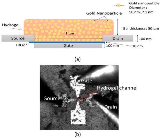 We also developed a potentiometric (measured the potential across the hydrogel with current ~0) technique to monitor the changes in ionic content of the hydrogel. The potentiometric approach was used in the past to construct hydrogel-based batteries and piezoelectric transducers [,] but was not used as a transduction technique for hydrogel sensors. Here, the electric potential across the hydrogel was used to detect the ionic concentration gradient across the hydrogel due to an analyte. This phenomenon was then exploited to design a novel metal-oxide-hydrogel field-effect transistor (MOHFET) whose channel material is a smart hydrogel. The MOHFET [] design was based on an open-face Field-Effect Transistor (FET) structure reported before [,,,]. Here, drop-casting was used for depositing the hydrogel channel. The MOHFET characteristics changed as a function of the hydrogel’s ionic content. Furthermore, a MOHFET with gold nanoparticles, (AuNP)-embedded, was developed []. This gold-doped hydrogel channel increases the conductivity of the MOHFET channel compared to the undoped MOHFET channel. MOHFETs are of great interest because they can be used to detect the microscopic biomolecules in media with high ionic concentrations without the limits imposed by the double electrical layer shielding the effect of the ionic medium (Debye-length free sensing) []. The threshold voltage of the MOHFET reported in this paper varied reproducibly with the concentration of the analyte that was measured.