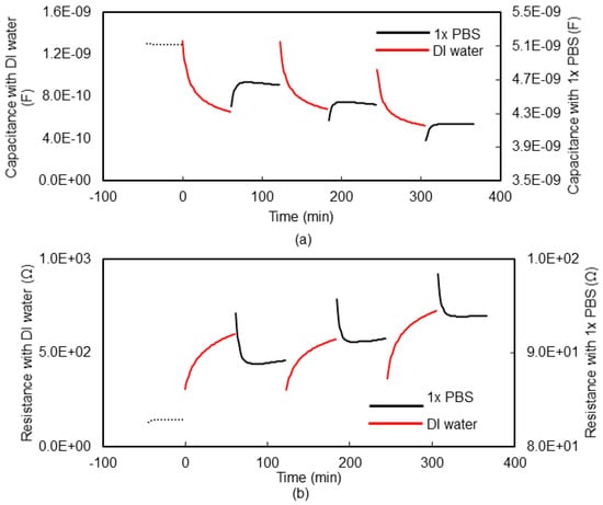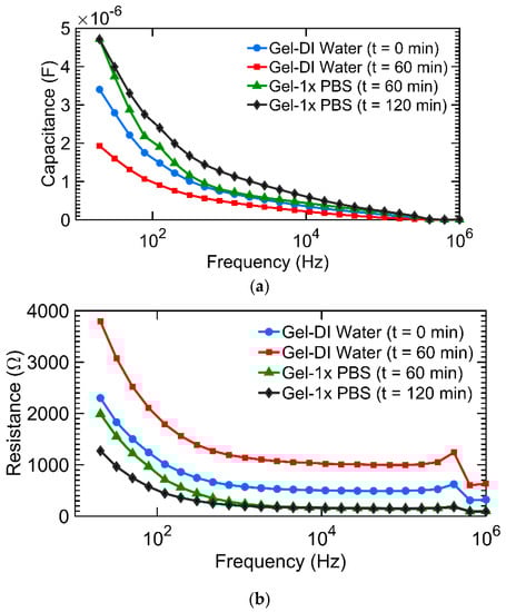 Figure 7a,b show the measured impedance (capacitance and resistance) of the DI water and 1× PBS of the hydrogel sensor (sensor shown in Figure 3) as a function frequency at different times. The measurements were taken over a frequency range of 20 Hz to 1 MHz at 4 different times. Time t = 0 was when the hydrogel was taken from its original 1× PBS medium, placed at the inter-electrode gap of the fluidic cell, and DI water added to the fluidic cell; time t = 60 min was at 60 min and this was the time when the DI water was siphoned out of the fluidic cell and replaced with 1× PBS and so on, as indicated in the insets of Figure 7. Figure 8a,b shows the result of the continuous monitoring of hydrogel capacitance and resistance over cycles of adding 1× PBS and DI water to the fluidic cell at a single frequency. The single frequency for the continuous monitoring (every 1.28 min) of the hydrogel was 638 kHz. It can be seen from these results that the signature of the hydrogel response to DI water is a decrease in sensor capacitance, while the signature of hydrogel response to 1× PBS is an increase in sensor capacitance. The reverse is the case for sensor resistance.