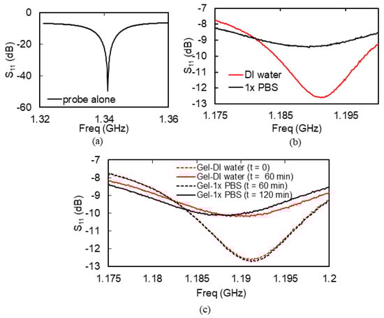 Microwave reflection spectra of the microwave probe. (a) Spectrum of the microwave probe with no hydrogel or analyte; (b) Spectrum of the microwave probe with analyte but no hydrogel; (c) Spectra of the microwave probe with hydrogel for different analytes at different times.