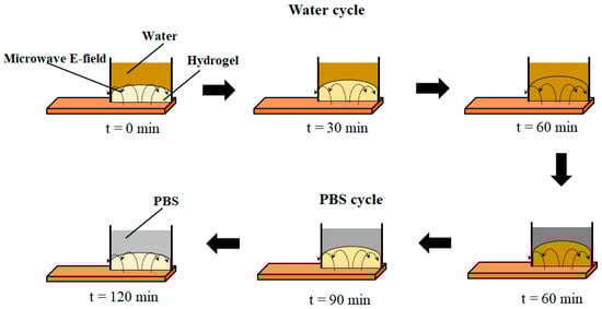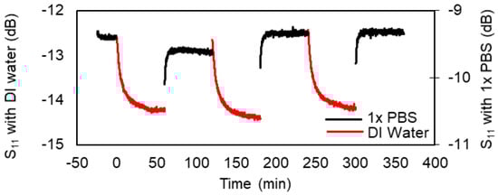 The hydrogel from impedance spectroscopy measurements was used in the contact-microwave hydrogel sensor device shown in Figure 4. The S11 spectrum of the microwave resonator probe and fluidic cell assembly before loading the hydrogel and the analyte into the fluidic cell is shown in Figure 9a. Figure 9b shows the S11 of the probe assembly when the fluidic cell of the probe was loaded with DI water or with 1× PBS, without hydrogel integration with the resonator. With only the analyte present in the fluidic cell, the S11 spectra of the sensor did not change significantly with time. Figure 9c shows the S11 of the probe loaded with DI water and 1× PBS, now with the hydrogel at the tip of the resonator inside the fluidic cell. This measurement was done over a frequency band of 1.175 GHz to 1.2 GHz at 4 different times. At time t = 0 the hydrogel was taken from its original 1× PBS medium, placed in the fluidic cell at the tip of the microstrip resonator, and DI water added to the fluidic cell. At time t = 60 min, the DI water was siphoned out of the fluidic cell and replaced with 1× PBS; and so on. Figure 10 shows the result of continuously monitoring (every 6 s) the S11 of the hydrogel sensor over cycles of 1× PBS and DI water at a chosen frequency within the 1.175 GHz to 1.2 GHz band. The chosen single frequency for this S11 monitoring was 1.1917 GHz. This frequency was chosen because it is the frequency where the S11 change of the sensors was maximum when the analyte was changed from DI water to 1× PBS.