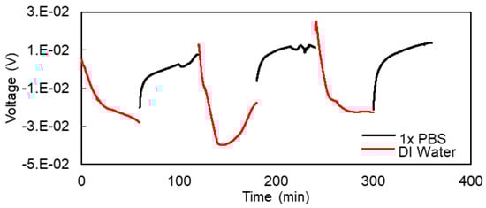 Potential generated across the hydrogel sensor as a function of time in response to 1× PBS and DI water.