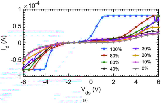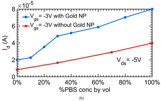 Based on the observed potentiometric responses of the hydrogel to analytes from the measurement of the previous section, the hydrogel was used to develop a field-effect transistor (FET) sensor. This hydrogel sensor with FET was designed by using undoped and gold nanoparticle-doped hydrogel as the channel material in an open-channel FET structure. In earlier publications, we have reported the fabrication and characterization of this device, used as a platform for experimenting with different post-deposited channel materials [,]. The FET consisted of a bottom-embedded gate with hafnium oxide gate dielectric [,] and surface-exposed platinum drain and source electrodes with effective channel length of 1 µm. The drop-cast hydrogel thickness was 50 µm. The schematic and photograph of this FET sensor is shown in Figure 6. The electrodes of the sensor were connected to a 4156A HP Precision Semiconductor Current-Voltage Parameter Analyzer (Hewlett Packard, CA, USA) through a probe station. The experiment with this FET was carried out with various concentrations of PBS (percentage by volume). The IV Characteristics curve of the FET were recorded for gate-source voltage (Vgs) of −3 V, 0 V and +3 V for drain-source voltage (Vds) from −6 Volt to +6 Volt.