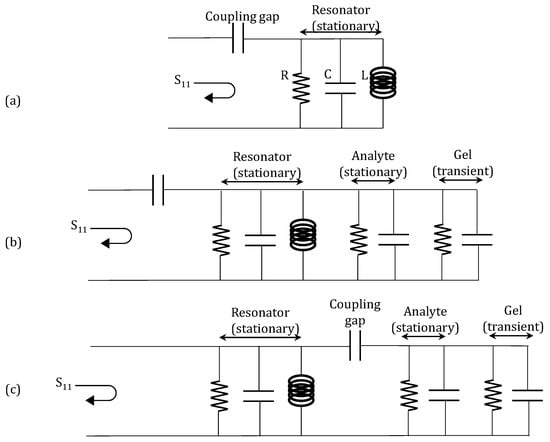 Circuit model of hydrogel sensing with microwave. (a) Circuit model of the microstrip microwave resonator; (b) Circuit model of the resonator, analyte and hydrogel of the hydrogel sensor with contact-mode microwave readout; (c) Circuit model of the probe, analyte and hydrogel of hydrogel sensing with remote microwave readout.