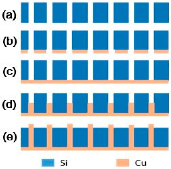 The electroplated copper growth process. (a) TSVs were etched and the SiO2 insulation layer was deposited. (b) The adhesion layer (Cr, 30 nm) and seed layer (Cu, 300 nm) were sputtered. (c) Electroplated copper covered the TSVs. (d) Electroplated copper was grown in TSVs. (e) The TSVs were fully filled.