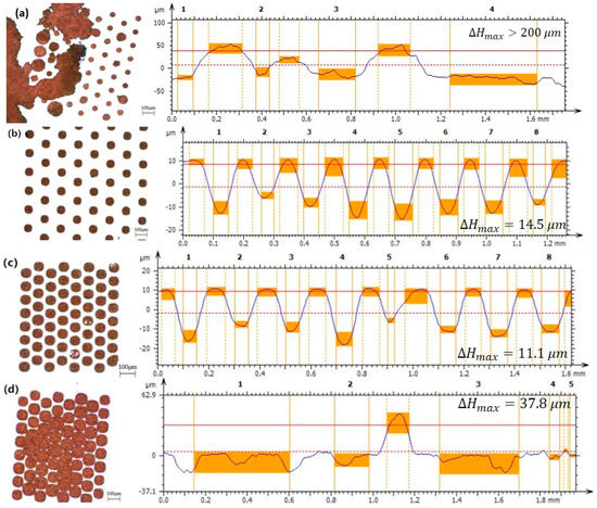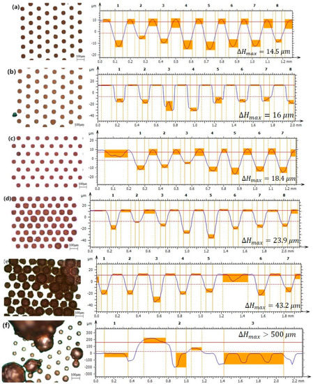 Experiments 1 to 7 were designed to determine the relationship between current density and electroplating effect, in which the current density from 0.25 to 2 A/dm2 was used for the experimental variables. The top views of the copper filling TSV arrays were photographed using an optical microscope. To obtain the results, we selected the cross-section with the greatest height, analyzed the topographical features of the section, and obtained the maximum height of the section. The top views and profile height diagram obtained from the most disparate section in terms of height difference are shown in Figure 5a–f.