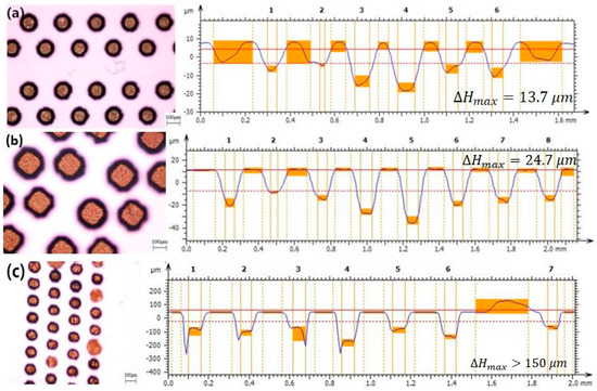 Top views and profile height diagram taken from the section with the greatest height difference using different shape holes using an optical microscope and a confocal displacement detector, respectively: (a) circle, (b) square, and (c) oval holes.