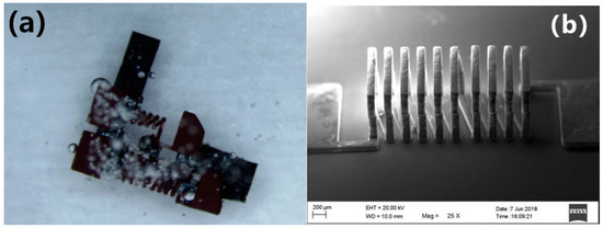 In order to obtain an air-core MEMS inductor, the silicon core inductor was immersed in 8% TMAH (Tetramethylammonium Hydroxide) solution for nearly 16 h and silicon was removed using the wet etching method. The final solenoid inductance is shown in Figure 11.