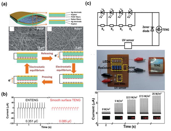 - Zheng, Y.; Cheng, L.; Yuan, M.; Wang, Z.; Qin, Y.; Wang, T. An electrospun nanowire-based triboelectric nanogenerator and its application in a fully self-powered UV detector. Nanoscale 2014, 6, 7842–7846. [Google Scholar] [CrossRef] [PubMed]