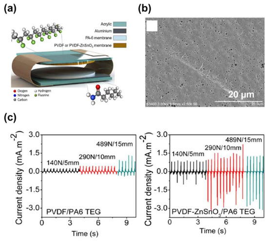 - Soin, N.; Zhao, P.; Prashanthi, K.; Chen, J.; Ding, P.; Zhou, E.; Shah, T.; Ray, S.C.; Tsonos, C.; Thundat, T.; et al. High performance triboelectric nanogenerators based on phase-inversionpiezoelectric membranes of poly(vinylidenefluoride)-zinc stannate (PVDF-ZnSnO3) and polyamide-6 (PA6). Nano Energy 2016, 30, 470–480. [Google Scholar] [CrossRef]