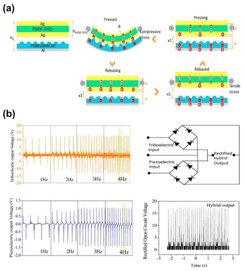 - Wang, X.; Yang, B.; Liu, J.; Zhu, Y.; Yang, C.; He, Q. A flexible triboelectric-piezoelectric hybrid nanogenerator based on P(VDF-TrFE) nanofibers and PDMS/MWCNT for wearable devices. Sci. Rep. 2016, 6, 36409. [Google Scholar] [CrossRef] [PubMed]