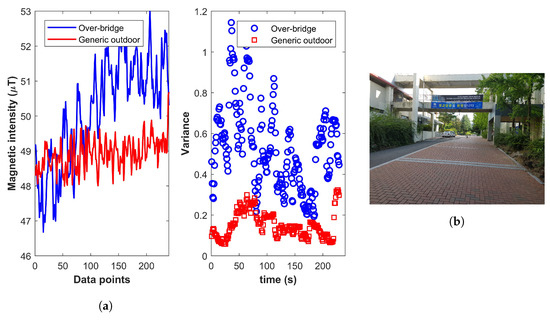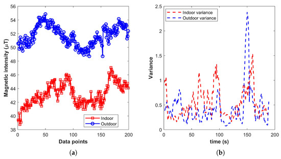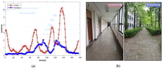 Magnetic variance for the indoor and outdoor environment. (a) Magnetic variance; (b) Indoor & outdoor environment of given variance.