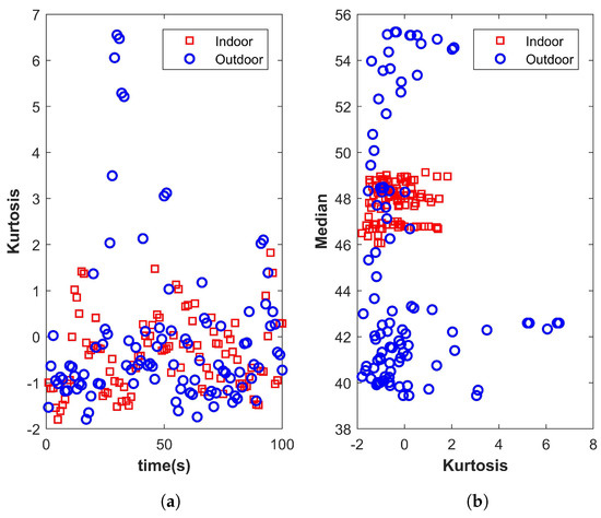 (a) Kurtosis and (b) kurtosis and median for the indoor and outdoor environment.