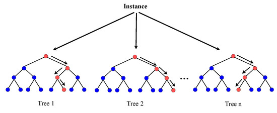 Random forest is a combination of tree classifiers where each tree is generated with a random vector from the input vector. Each tree has a unit vote for the most probable class to whom the input vector belongs [48]. A typical random forest is shown in Figure 6.