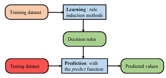 Rule induction produces classifiers that are based on simple, yet effective and powerful ‘If–Then’ rules for decision makers [54]. The data contain regularities in the form of attributes, which are frequently expressed in terms of rules [55], so those rules can be written and used to describe the relation: