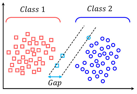 Support vector machines were developed by Cortes and Vapnik [58] for binary classification. SVM represent a powerful machine learning technique, which can perform nonlinear classification, regression and outlier detection [59]. SVM perform class separation by dividing the hyperplane optimally such that the distance/gap between the two classes is maximized. The points lying on the boundaries are called support vectors, as shown in Figure 9.