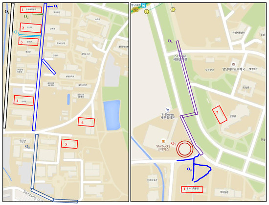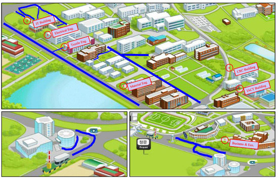 The experiments are performed at three different places (as shown in Figure 10) including Yeungnam University, Gyeongsan campus, a shopping mall and an underground subway station in the Republic of Korea. The data are collected from various parts of the campus for indoor and outdoor environments. The shopping mall (Homeplus) is a 6-floor building including 2 basements. Indoor data are collected from all floors, while outdoor data are collected from its surroundings. The mall is situated on the brink of the main road, and heavy traffic makes magnetic data volatile.