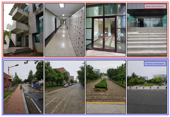Figure 13 shows various scenes that are included in indoor and outdoor environments. The covered entrances of the buildings, as well as the stairs connected with the buildings are categorized as the indoor environment. The rationale to associate them with the indoor environment is the impact that indoor infrastructure has on the magnetic field. As mentioned earlier, the magnetic field is disrupted due to ferromagnetic materials; the stairs connected with the buildings and entrances have similar perturbations. Therefore, the main entrances and similar other structures are classified as indoors. However, open areas including the ones that are even very close to the buildings are categorized as outdoors.