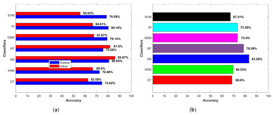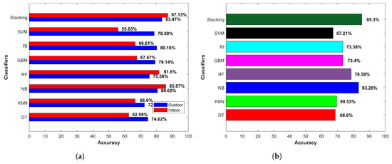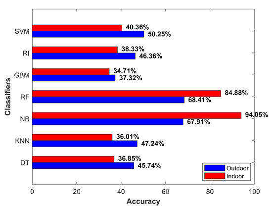 Bhargava et al. in [30], proposed a scheme named SenseMe, which can sense environmental context, as well as the context-aware location. The system used the data from GPS in addition to smartphone sensors’ data including gyroscope, accelerometer and the Bluetooth module. Three different environments, indoor, outdoor and indoor-outdoor, were detected using the C4.5 classifier on data collected over a time span of 1 min. The proposed scheme was able to achieve a classification accuracy of 98.4%, 93% and 82% for indoor, outdoor and indoor-outdoor environments, respectively. Canovas et al. in [31], presented a binary classification technique that utilized the RSSI (received signal strength indicator) from 802.11 access points to identify a device’s indoor or outdoor state. RSSI features from different APs were fed as input to a weak learner to be trained on, during the offline phase. The proposed method was compared with the nearest neighbor and naive Bayes to show its performance.